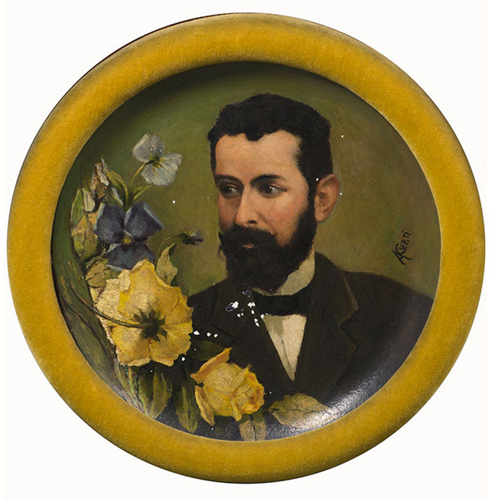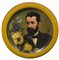 (attr.) "Gentiluomo con fiori" piatto in porcellana (diam. cm 40) dipinto ad olio firmato a destra. In cornice di velluto (difetti e restauri) A. Curti (Milano 1858 - Cannobbio 1945) (attributed) "Gentleman with Flowers" oil painted porcelain dish signed at right. Velvet frame (defects and restorations)