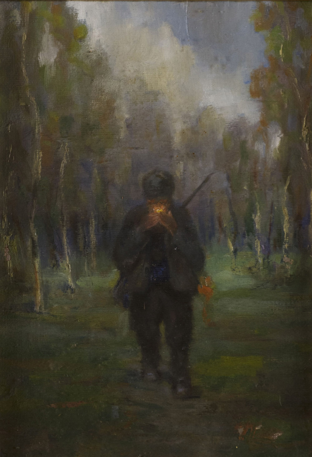 "Cacciatore nel bosco" olio su tela (cm 37,5x27) firmato in basso a sinistra....
