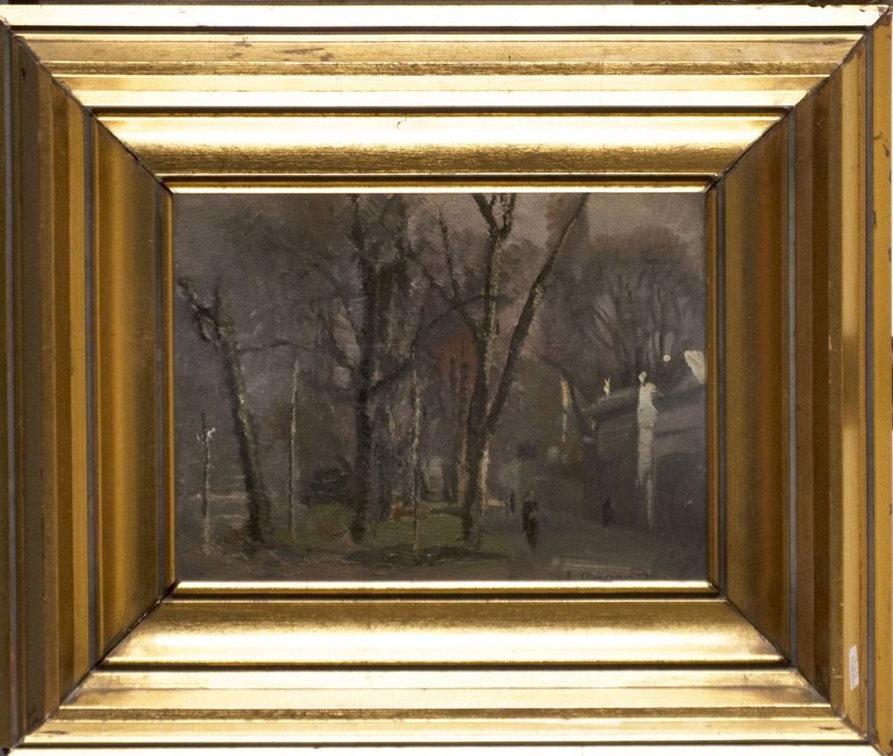 Alfonso Corradi 'Bozzetto dei boschetti di Milano vicino al garage proprio dietro all'Autoclub' olio su tavola (cm 16x22) firmato in basso a destra e titolato al retro. In cornice Alfonso Corradi "Sketch of the Woods in Milano Near the Autoclub", oil on panel, signed at bottom right and titled to reverse. Framed