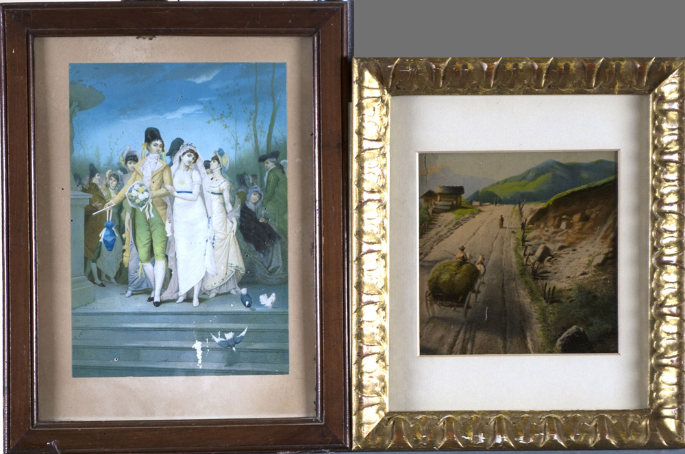 Lotto composto da un'oleografia raffigurante paesaggio con carro ed una stampa con scena galante (difetti) Lot comprising an oleography and a print (defects)