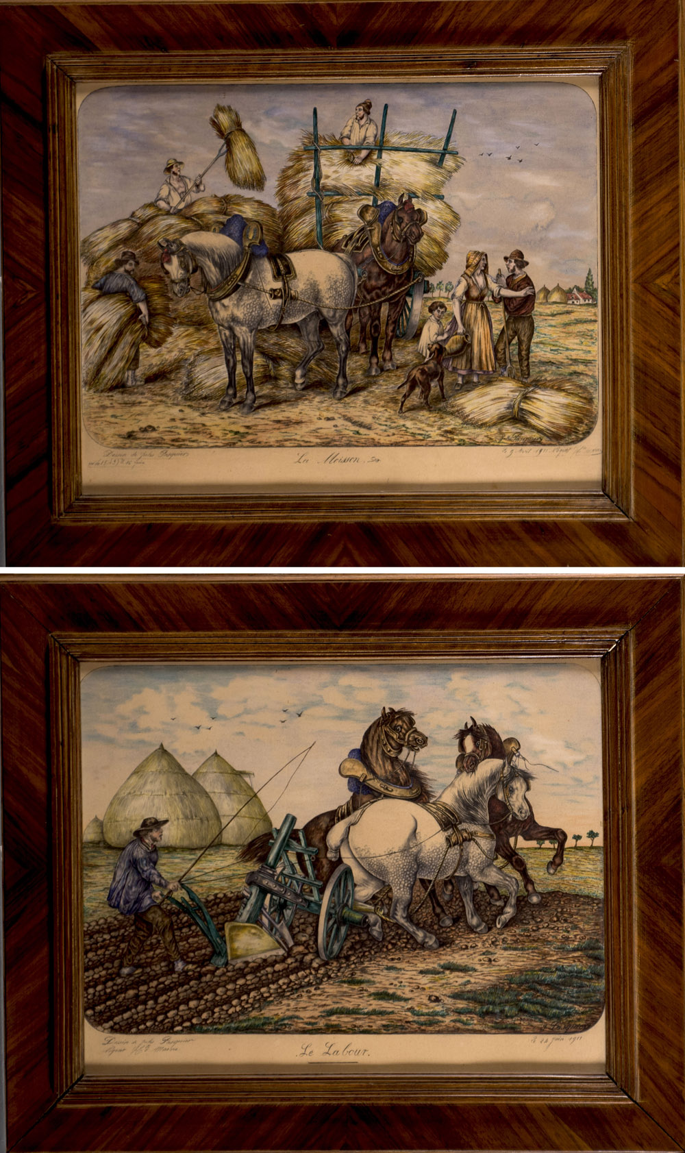 "La moisson" e "Le labour" coppia di acquetinte (45x55) In cornice lastronata in noce "La Moisson" and "Le Labour" pair of acquatints. Veneered frame