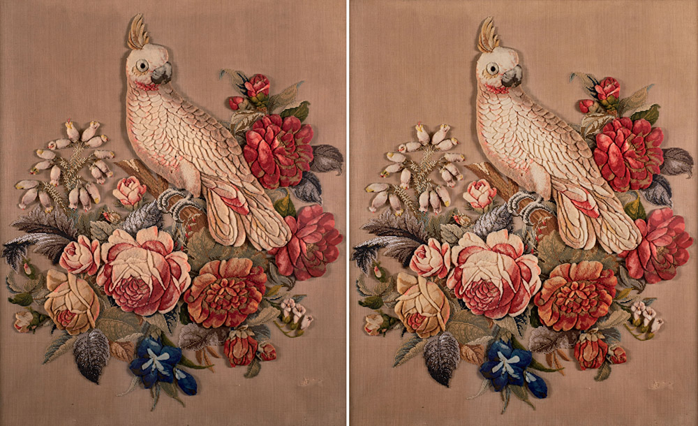Ricamo a piccolo punto raffigurante rose, fiori e pappagallo su ramo. Sec....