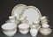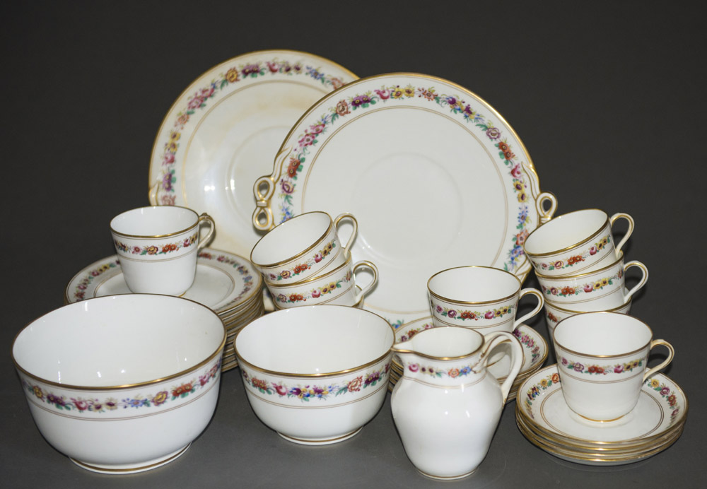 Manifattura del sec. XIX, servizio da caffè in porcellana policroma a fiori con bordi dorati composto da nove tazze con piattini, due piatti biansati, due ciotole e dieci piattini da dolce (difetti) Manufacture of the 19th century. Porcelain polychrome coffee set comprising nine cups and saucers, two plates two bowls and ten dessert plates (defects)