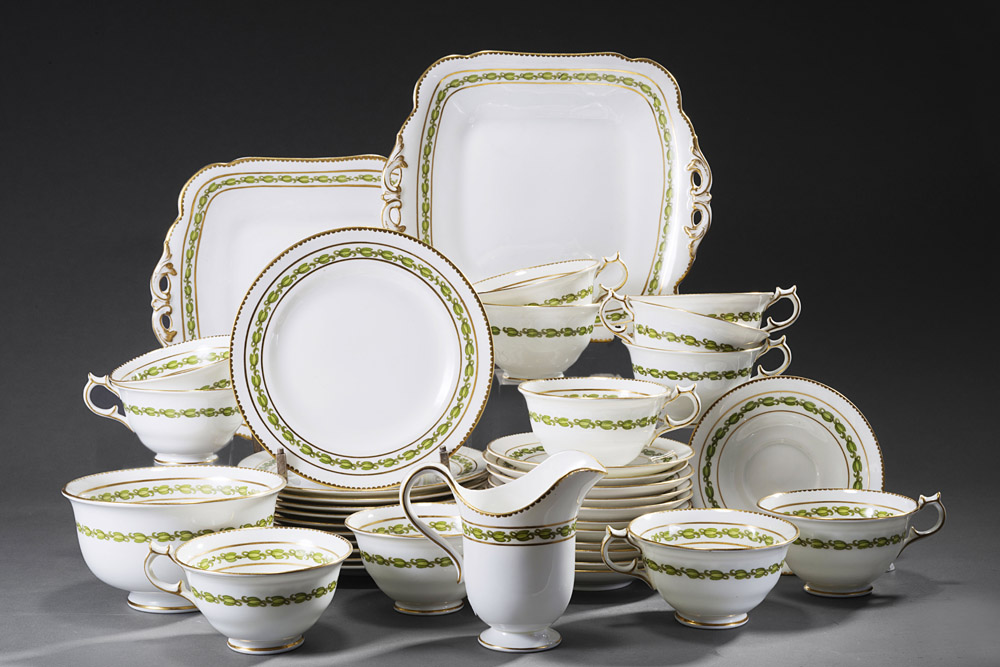 Servizio da thè composto da dodici tazze con piattini, lattiera, una ciotola, due vassoietti e undici piattini da dolce, in porcellana decorata con foglie nei toni del verde e profili dorati Porcelain tea-set comprising twelve cups and saucers, a milk jug, a bowl, two trays and eleven dessert plates