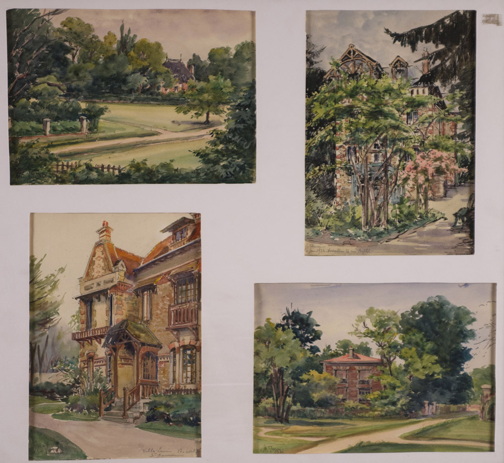 'Maisons et jeardins-Environs de Versailles et de St. Germain en Laye 1936' gruppo di quattro acquarelli firmati e datati. In un'unica cornice 'Maisons et jeardins-Environs de Versailles et de St. Germain en Laye 1936' , group of four watercolours signed and dated in single frame