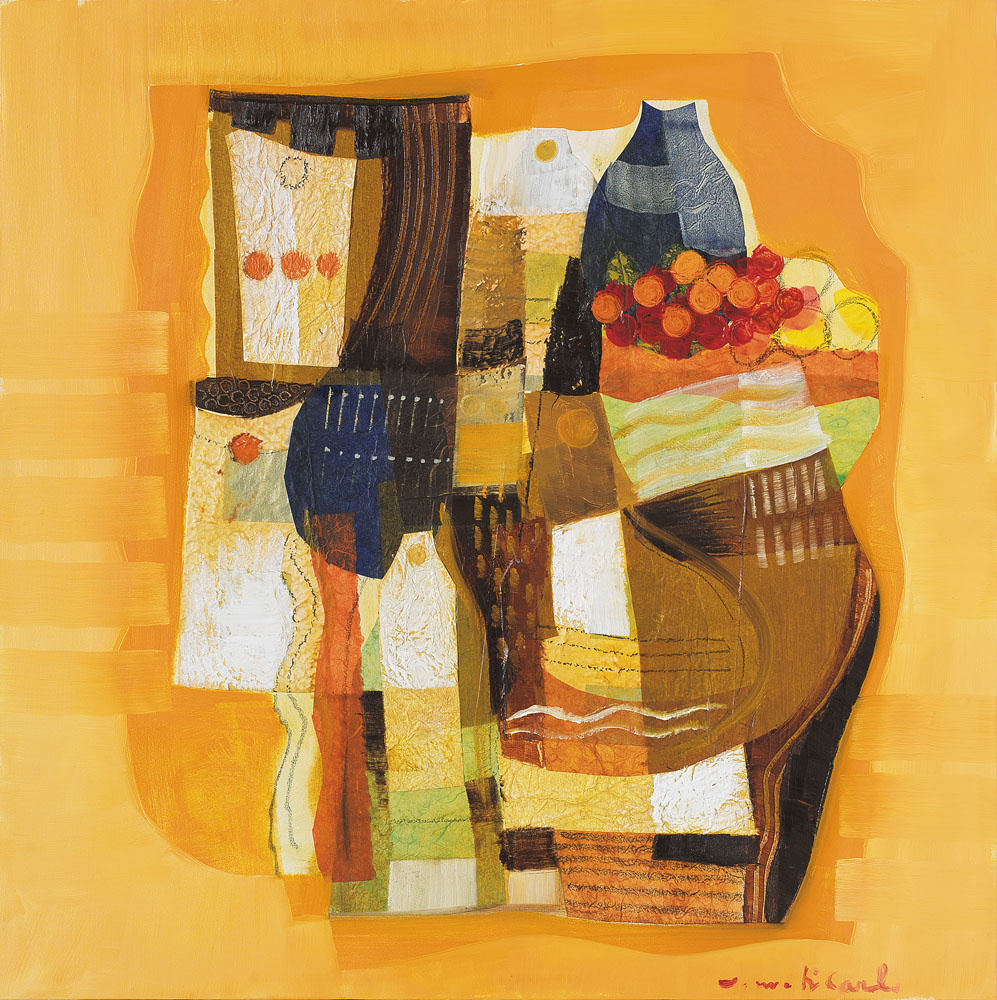 VITTORIOMARIA DI CARLO S. Marco in Lamis (Fg) 1939 Sari Sari, 2008 olio e collage su tela cm. 70x70, firma in basso a destra e al retro, dichiarazione d'autenticità e archivio dell'artista numero 200/2008 su foto.
