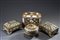 Manifattura orientale, gruppo di quattro scatole in metallo decorate con...