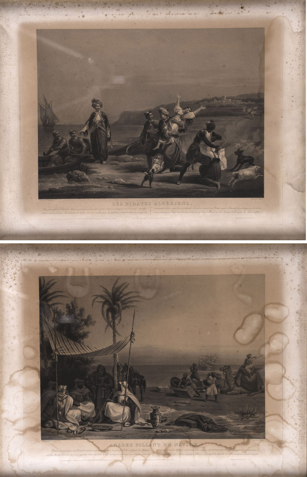 Coppia di acqueforti del sec. XIX da dipinti di Lecomte raffiguranti 'Les pirates algèriens' e 'Arabes pillant un navire' (cm 44x57) In cornici dorate (diffuse gore di umidità) Pair of etchings, 19th century from paintings of Lecomte representing "Les pirates algèriens' e 'Arabes pillant un navire'. Framed (overall humidity stains)