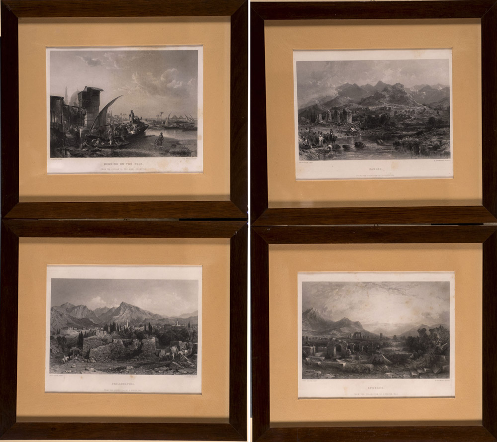 Gruppo di quattro incisioni all'acciaio raffiguranti scorci orientali (cm 27x21,5). In cornici Group of four steel engravings of oriental scenes. Framed