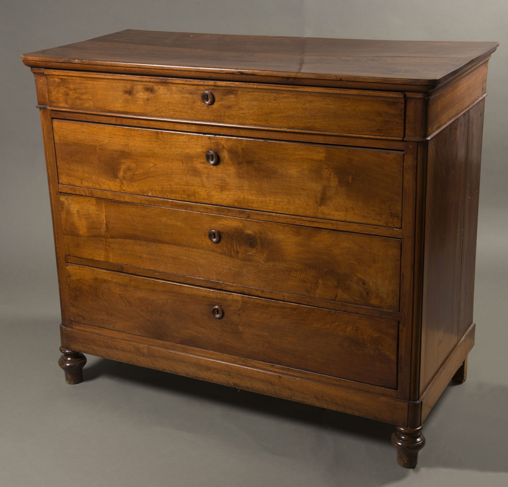 Comò in noce a tre cassetti e mezzo, con piedini anteriori torniti Sec. XIX (cm 120x104x57) Walnut wood chest of drawers, 19th century