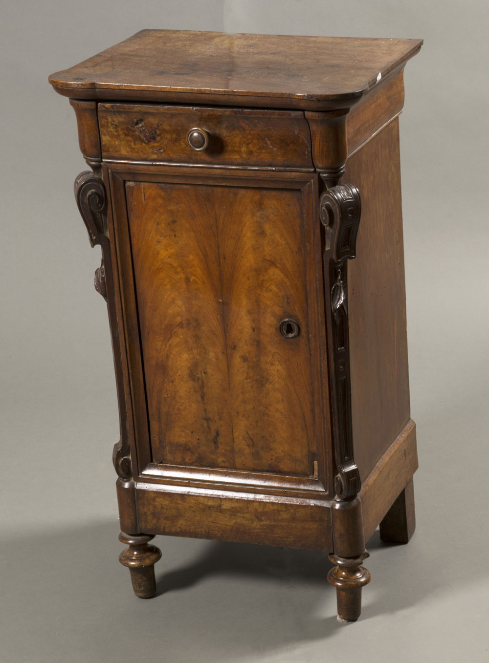 Comodino con piano sagomato ad un cassetto ed un'anta; montanti intagliati a volute e piedi torniti. Sec. XIX (cm 46x82x35) Shaped bedside table, 19th century