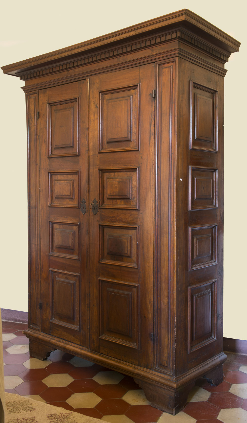 Armadio in stile seicentesco a due ante e fianchi riquadrati in noce;...