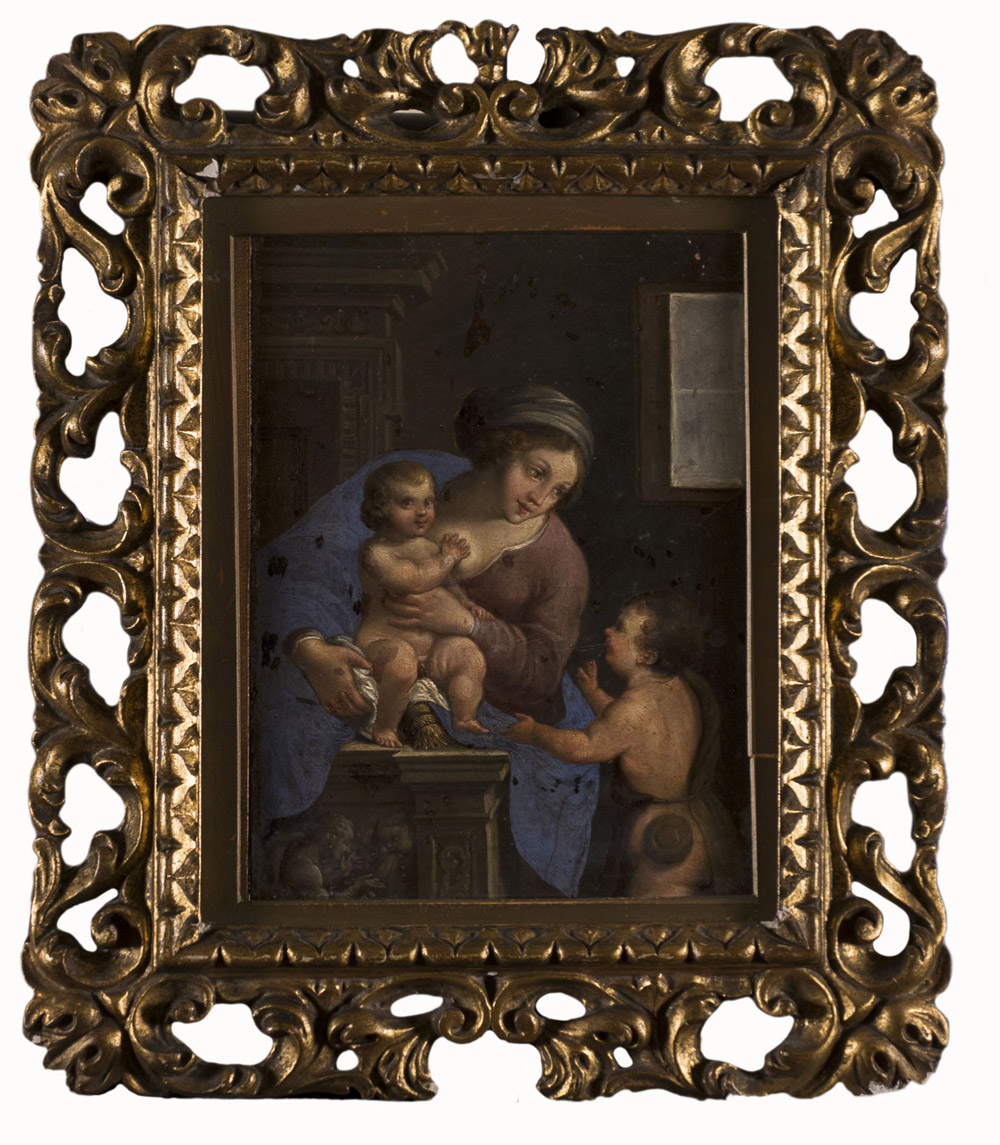 Scuola fine sec. XVIII 'Madonna con Bambino e San Giovannino' olio su tavola(cm 29x21) in cornice (difetti) School of the late 18th century "Madonna and Child and Saint John" oil on panel. Framed (defects)