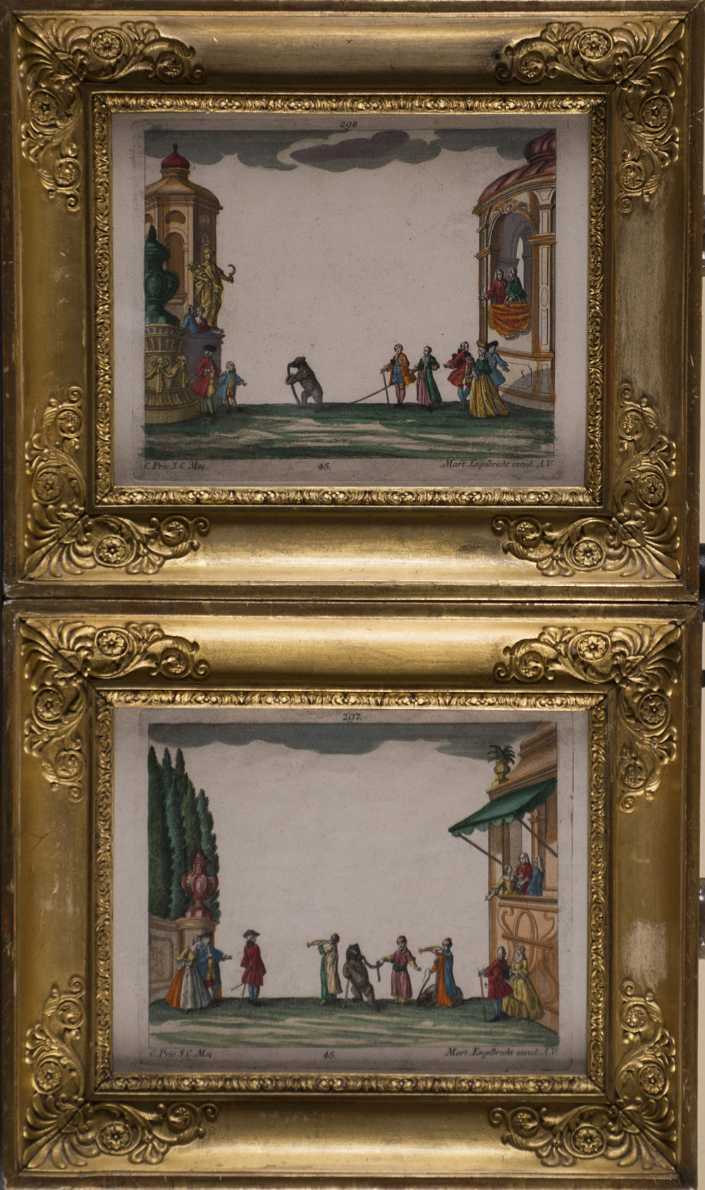 Coppia di acqueforti a colori raffiguranti personaggi e orso incatenato (cm 17,5x23) In cornici di legno e pastiglia dorata del sec. XIX (difetti) Pair of coloured etchings. Giltwood frames of the 19th century (defects)
