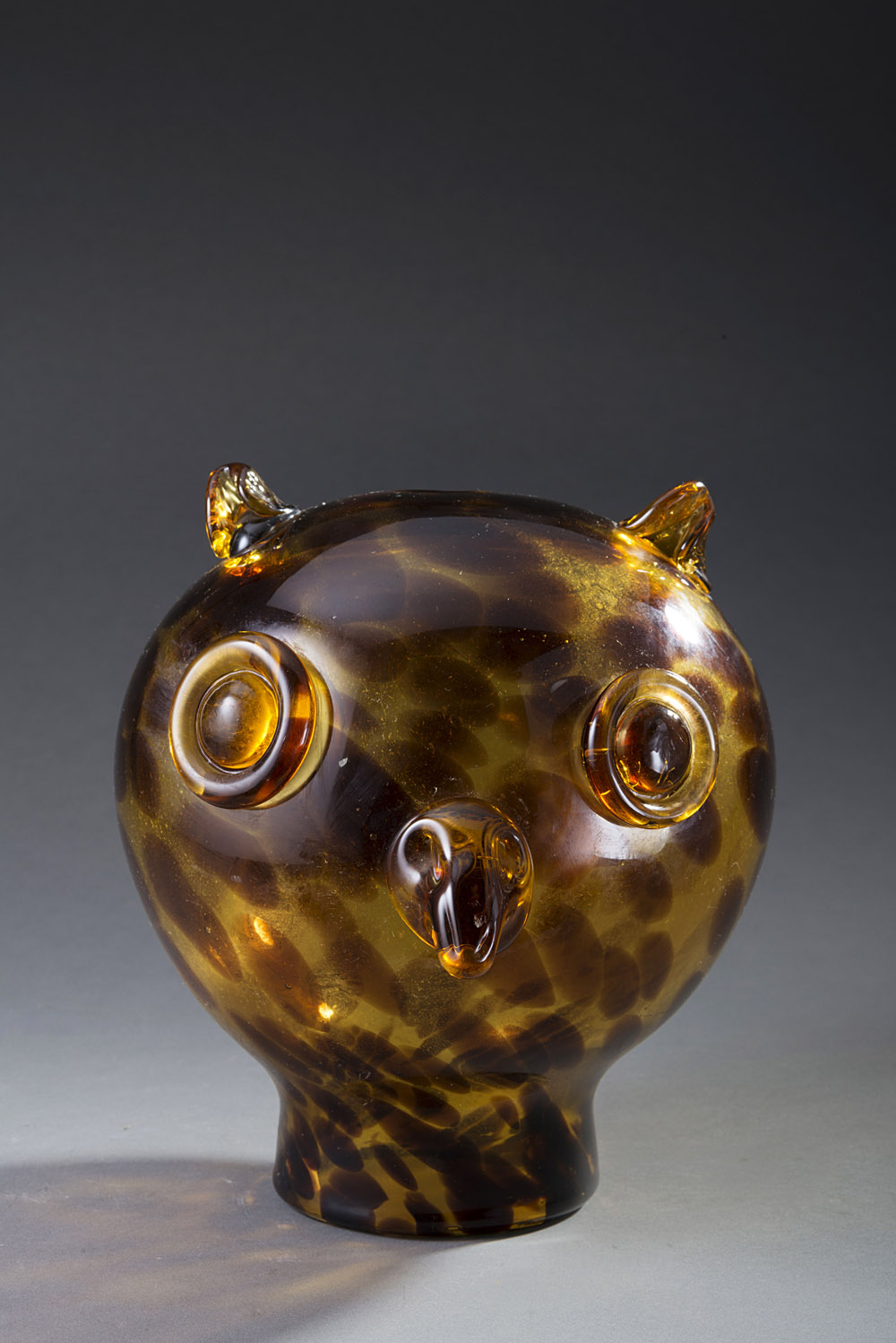 Manifattura di Murano, scultura in vetro paglierino e pasta vitrea raffigurante un gufo (h cm 23) Manufacture of Murano. Glass sculpture of an owl