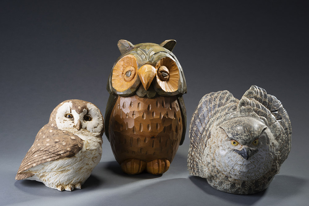 Tre sculture in materiali diversi raffiguranti 'Gufi' di cui due firmate Three owl sculptures in different materials (two signed)