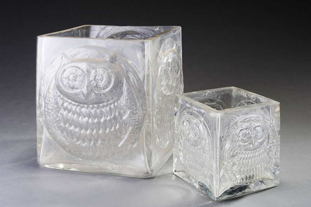 Lotto composto da due vasi in vetro squadrato decorato in rilievo a gufi (difetti) Lot comprising two glass relief decorated vases (defects)