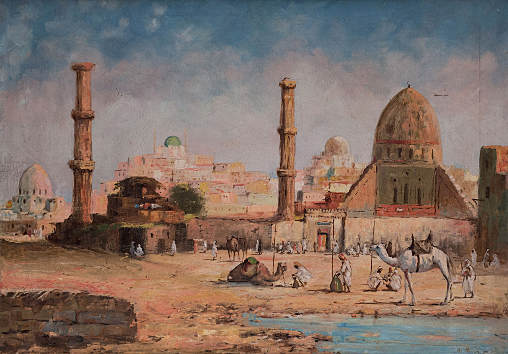 Firma indecifrata inizio sec.XX “Scorcio di città araba” olio su tela (cm.60X80) firmato in basso a destra. In cornice Undeciphered signature, early 20th century "View of an Arab City", oil on canvas, signed at bottom right. Framed