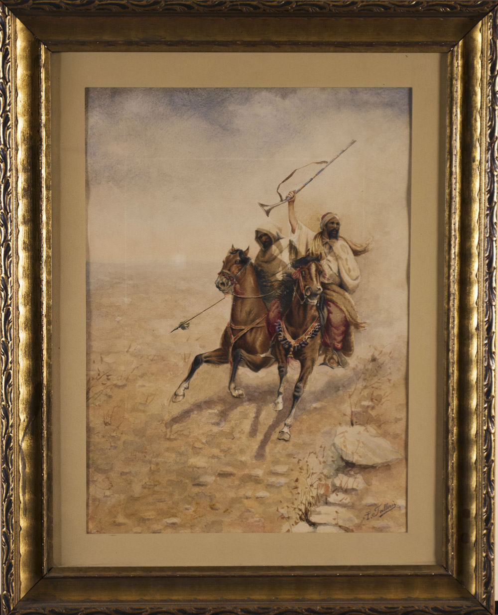 V. Talleris, sec.XIX “Berberi a cavallo “ acquarello su carta(cm.46X34) firmato in basso a destra. In cornice V. Talleris, 19th century "Berbers on Horseback" watercolour on paper, Signed at bottom right. Framed