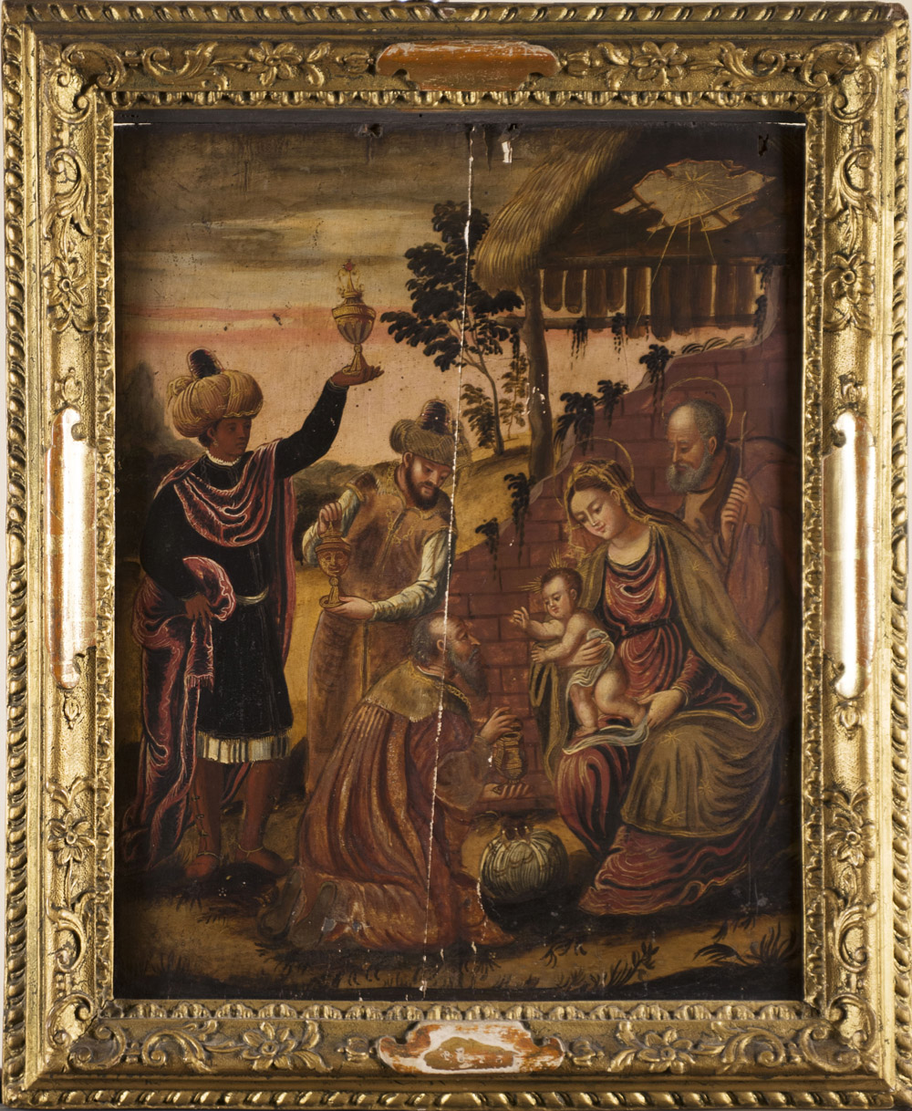Scuola veneto-cretese “L'adorazione dei Magi” antico dipinto ad olio su tavola (cm.50X42) In cornice intagliata e dorata del sec.XVIII (difetti e restauri) Veneto-cretan school "Adoration of the Magi" antique oil painting on panel. Carved giltwood frame, 18th century (defects and restorations)