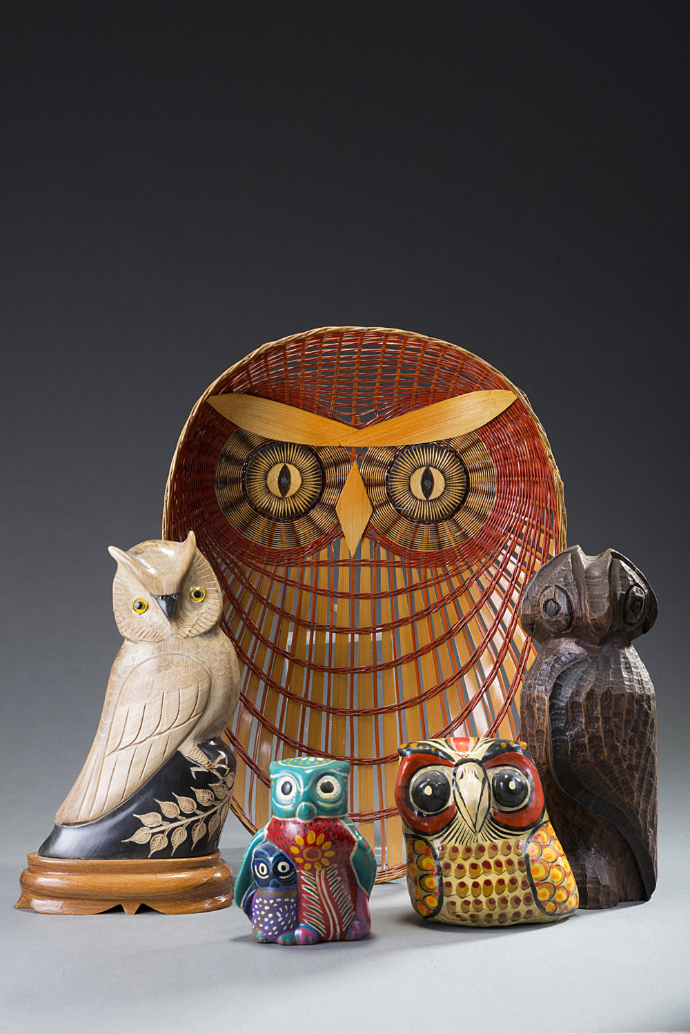 Lotto composto da numerose sculture in materiali diversi raffiguranti gufi Lot comprising numerous owl statuettes in different materials
