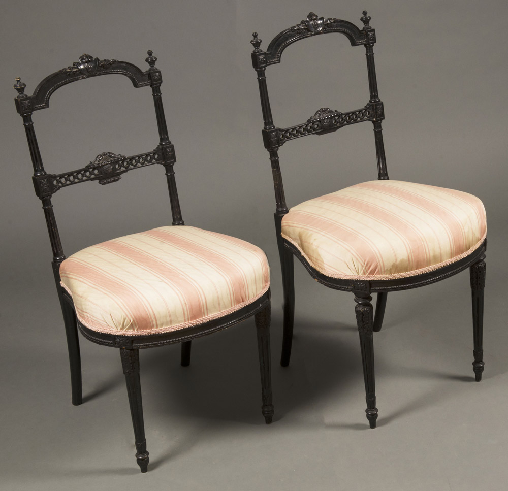 Coppia di sedie da camera in legno ebanizzato e schienale a giorno intagliato e traforato a volute fogliate. Fine sec. XIX Pair of ebonized wood bedroom chairs, late 19th century