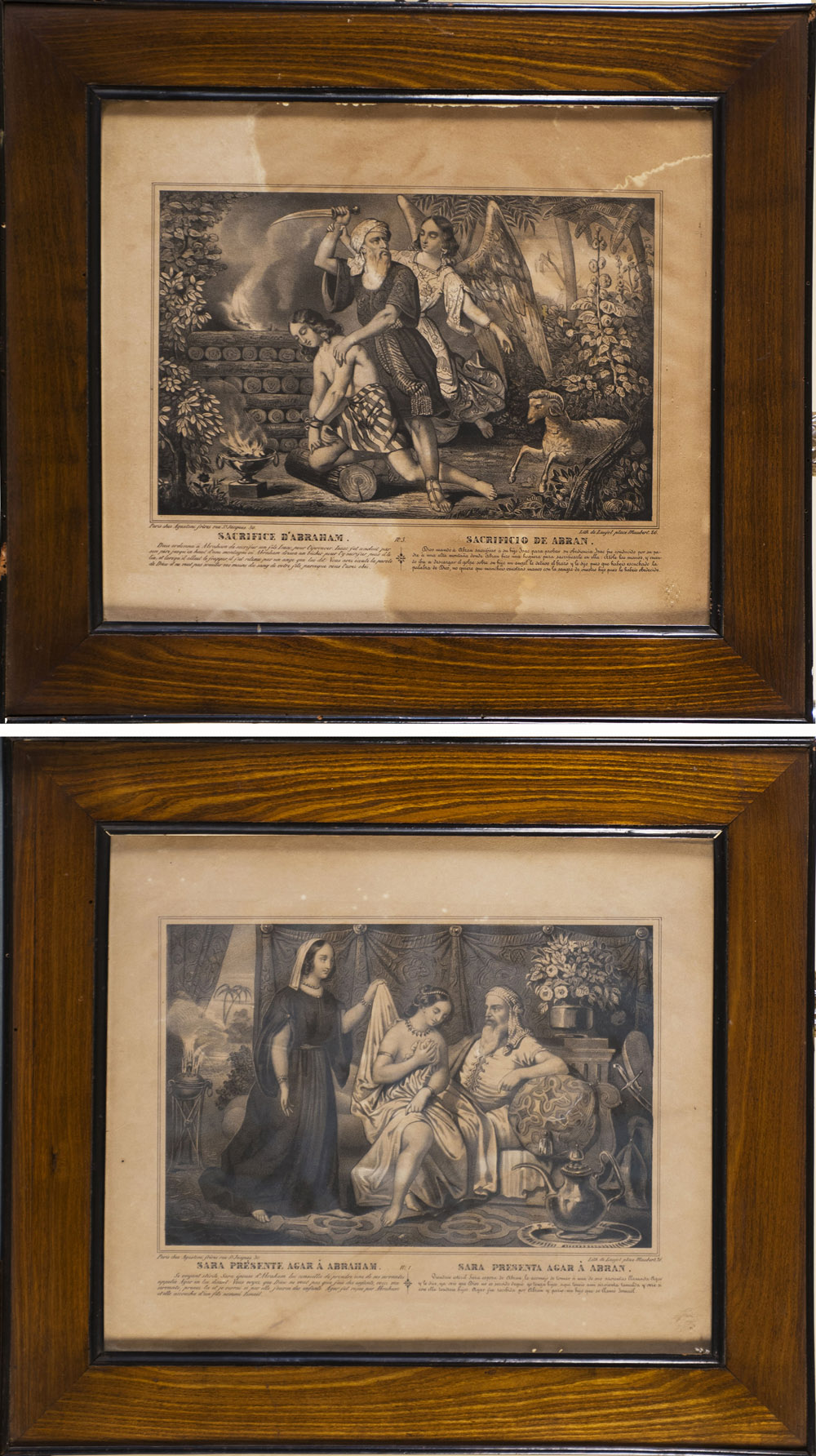 Coppia di incisioni del sec. XIX raffiguranti il 'Sacrificio di Abramo' e 'Sara presenta Agar ad Abramo' (cm 30x35). In cornici coeve con profili ebanizzati Pair of 19th century engravings "Abraham's Sacrifice" "Sarah Introduces Agar to Abraham". Coeval frames with ebonized profiles