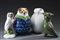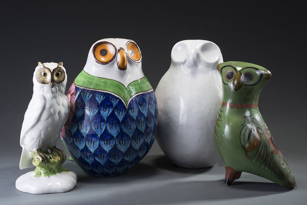 Lotto composto da quattro statuette raffiguranti gufi in materiali diversi (difetti) Lot comprising four owl statuettes in different materials (defects)