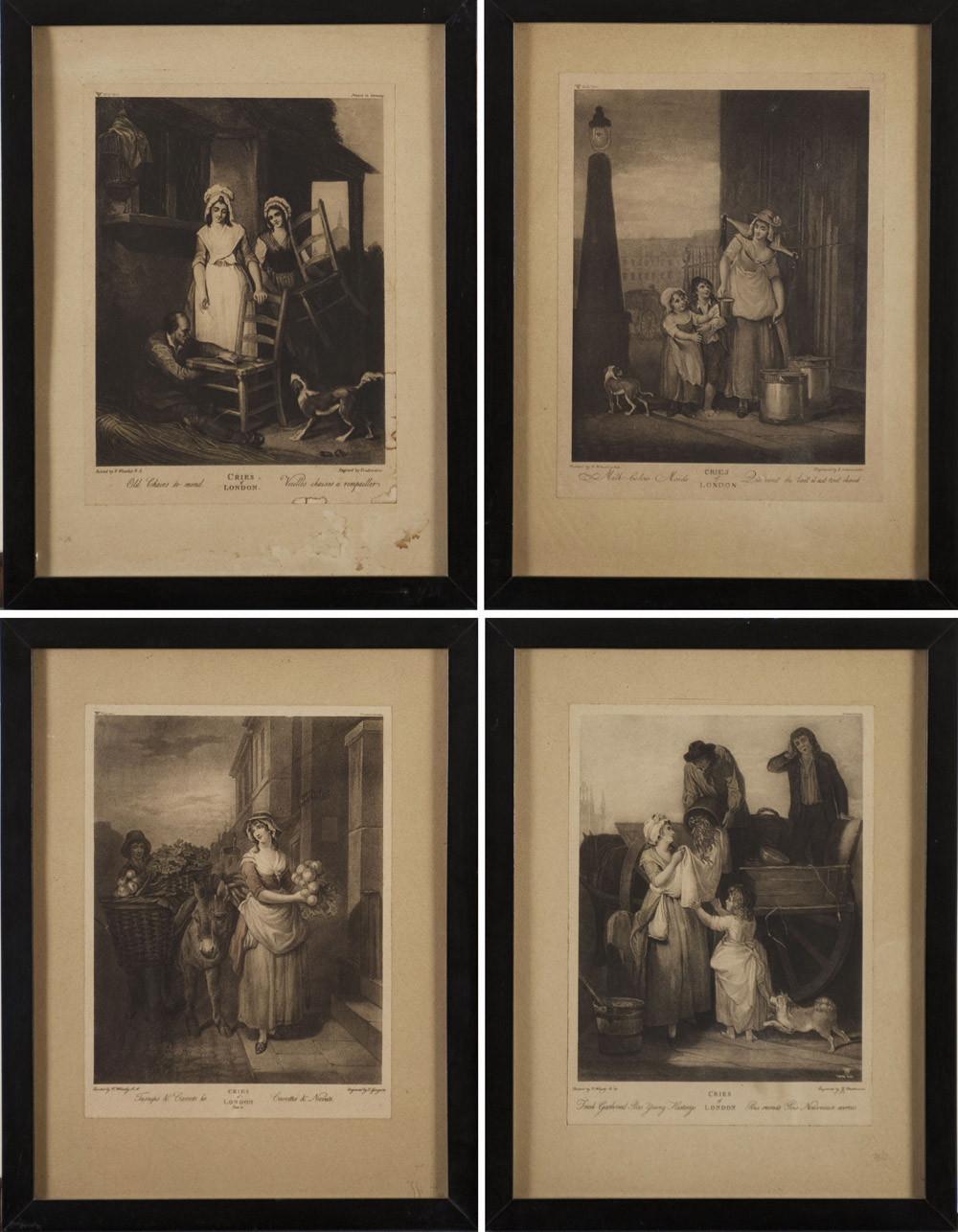 Gruppo di quattro incisioni del sec. XIX raffiguranti scene di vita (cm 26x19) In cornici Group of four engravings of the 19th century. Framed