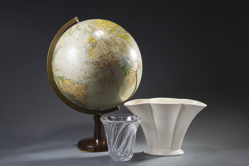 Lotto composto da un vaso in vetro marcato San Lambert, uno in ceramica bianca ed un mappamondo (gravi difetti) Lot comprising a glass vase marked San Lambert, a white ceramic vase and a globe (major defects)