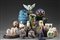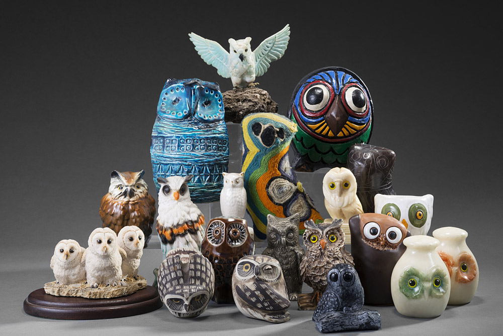 Lotto composto da venti statuette raffiguranti gufi in materiali...