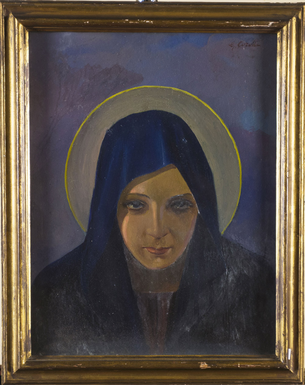 Firma indecifrata 'Mater Dei' olio su compensato (cm 50x40) firmato in alto a destra iscritto, titolato e datato 1936 al retro Undeciphered signature "Mater Dei" oil on plywood, signed at top right, inscribed titled and dated 1836 to reverse