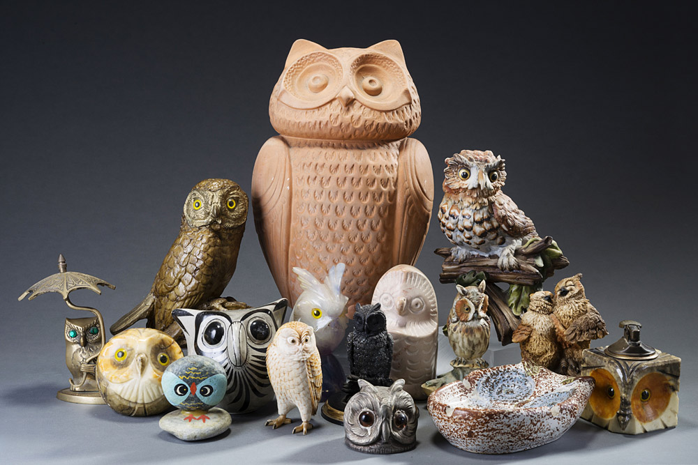 Lotto 606 | Lotto composto da sedici statuette raffiguranti gufi in materiali diversi...