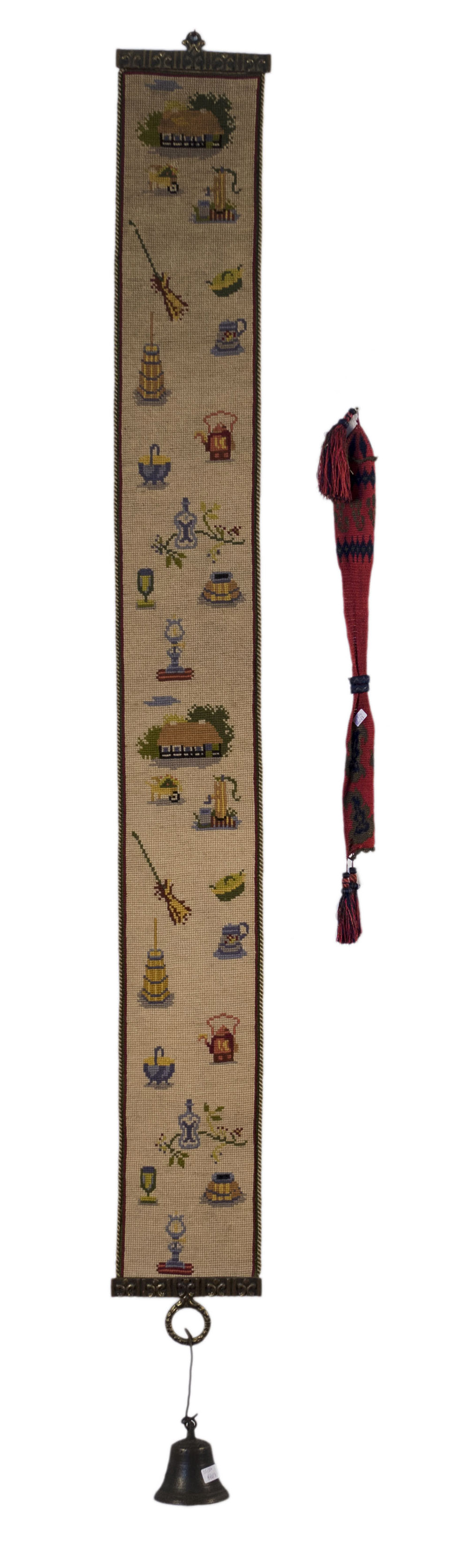 Lotto composto da un antico campanello e due oggetti ricamati . Sec. XIX Lot comprising an antique bell and two woven objects, 19th century