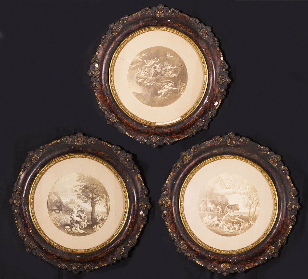 Gruppo di tre stampe di forma circolare raffiguranti tre dei Quattro Elementi, in cornici del sec.XIX in legno e pastiglia laccata (difetti) Group of four prints representing the Four Elements. Carved giltwood frames of the 19th century
