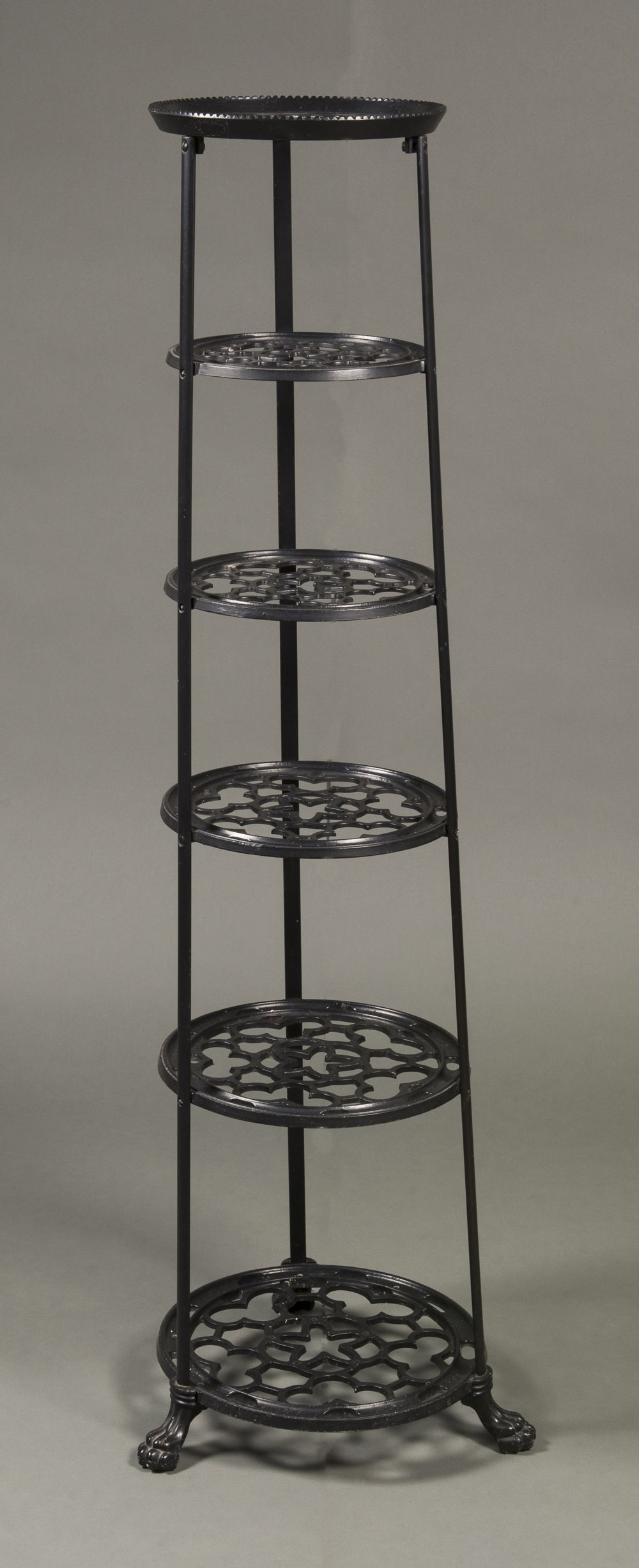 Trespolo portavasi con ripiani a scalare traforati a volute. Piedi ferini (h...