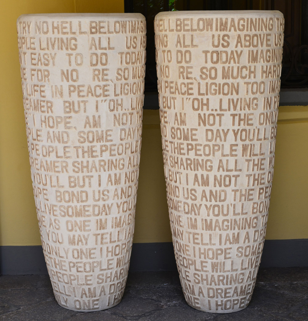 Lotto 622 | Due grandi vasi in resina decorati con iscrizioni in rilievo (h cm 158 ca)...