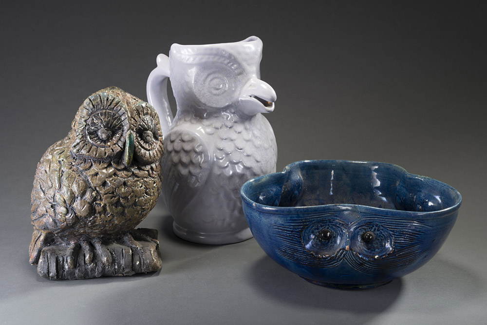 Lotto composto da tre statuette diverse raffiguranti gufi (difetti) Lot dcomprising three different owl statuettes (defects)