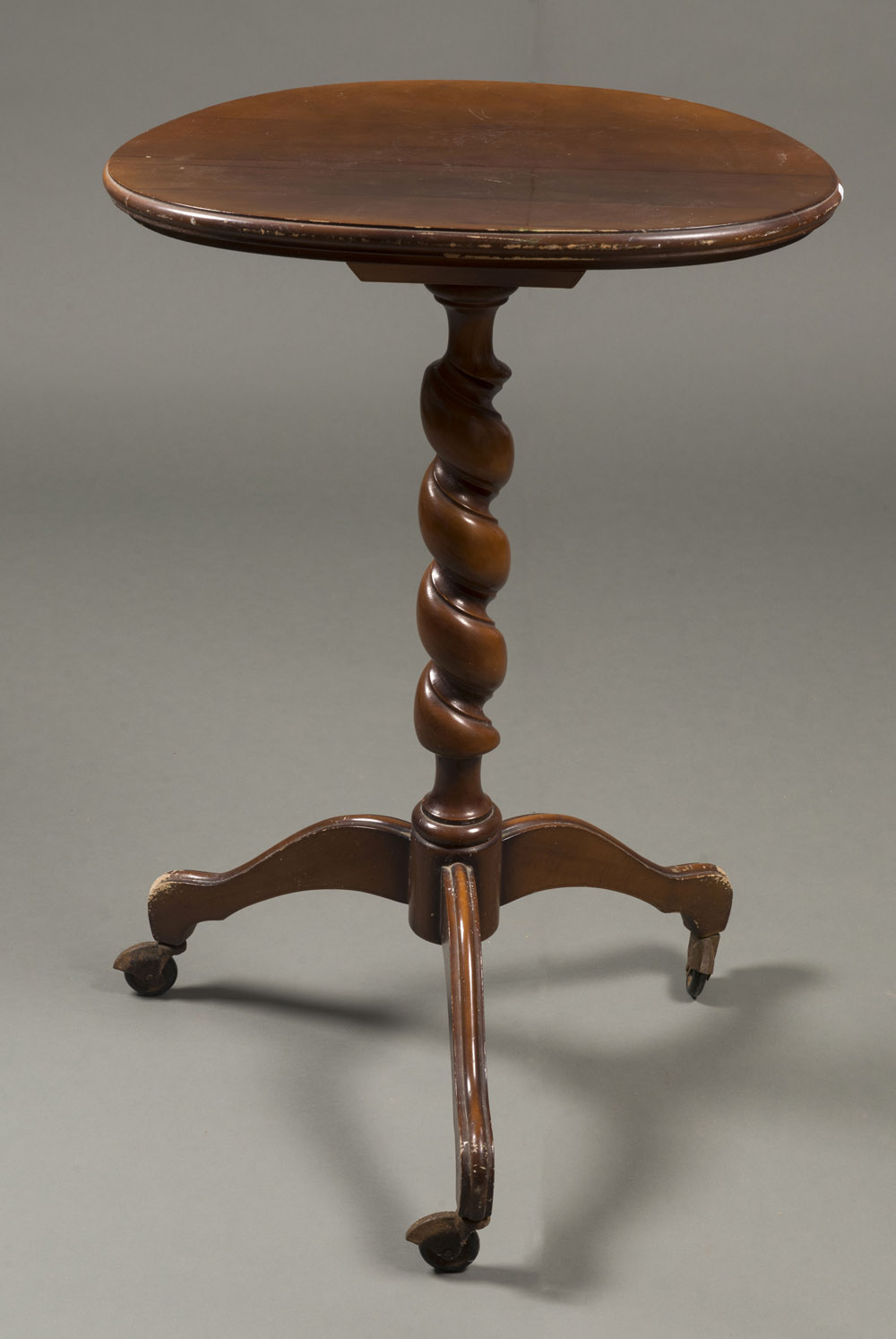 Tavolino ovale tripode con gamba centrale a torciglione (cm 60x78x40) (difetti) Tripod oval table (defects)