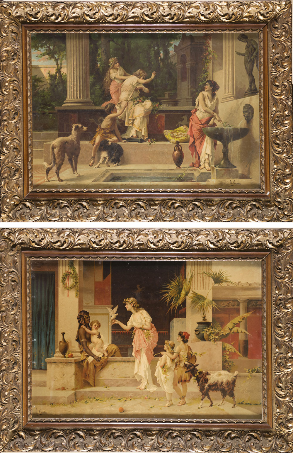 Coppia di oleografie a colori da Luigi Crosio raffiguranti scene classiche...