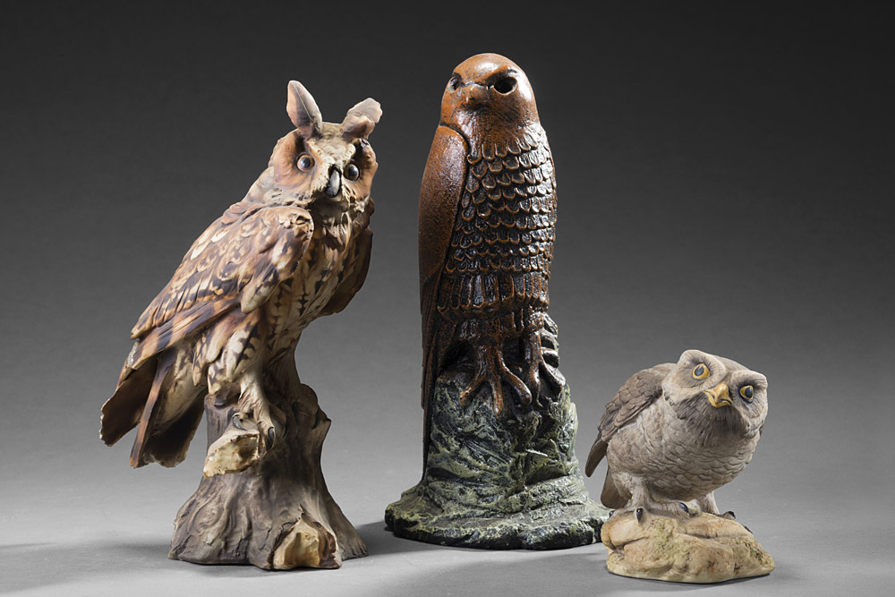 Lotto di tre statuette con gufi di materiali ed epoche diverse Lot comprising...