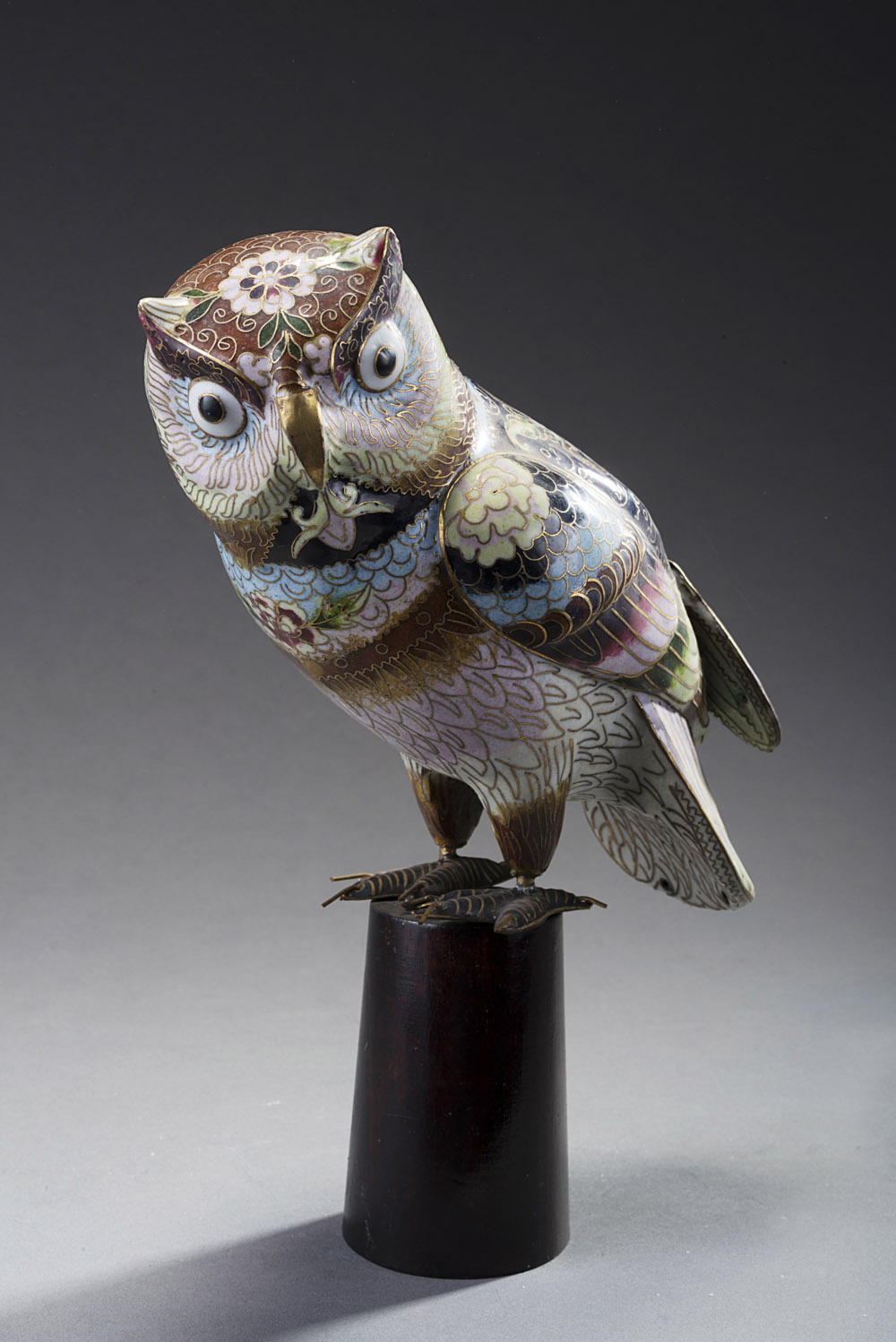 Manifattura di Cina Gufo in metallo cloisonné (h cm 16) poggiante su base in legno Chinese manufacture. Cloisonné metal owl on wooden base