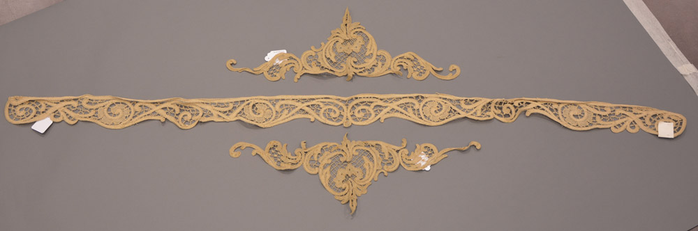 Lotto composto da tre finali tenda a tombolo. Sec. XX. Lot comprising three bibbin lace curtain borders, 20th century