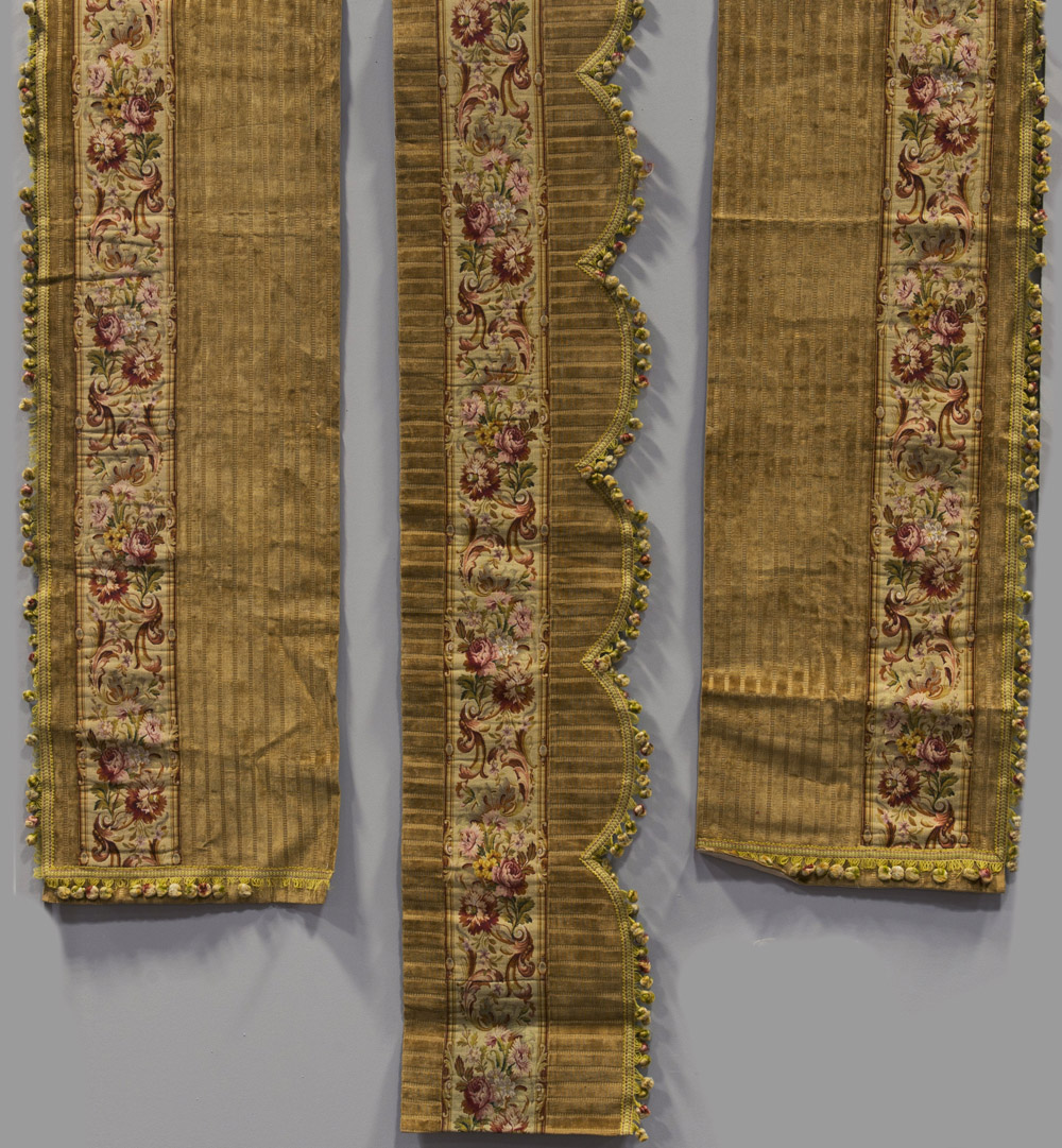 Mantovana e due laterali in velluto con frange, inserto a piccolo punto...