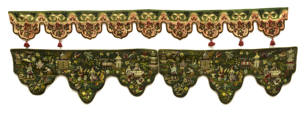Lotto di due mantovane a piccolo punto di cui una ricamata a foglie e l'altra a figure e fiori Sec. XX Lot comprising two petit-point needlework lambrequins, 20th century