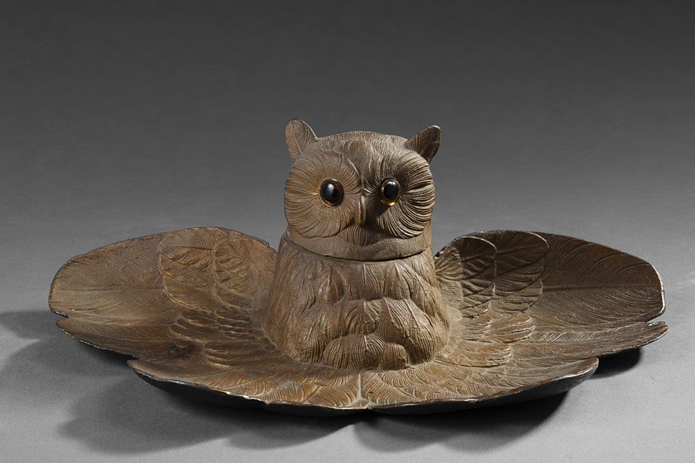 Manifattura di Vienna sec. XX Calamaio in ferro smaltato raffigurante un gufo...