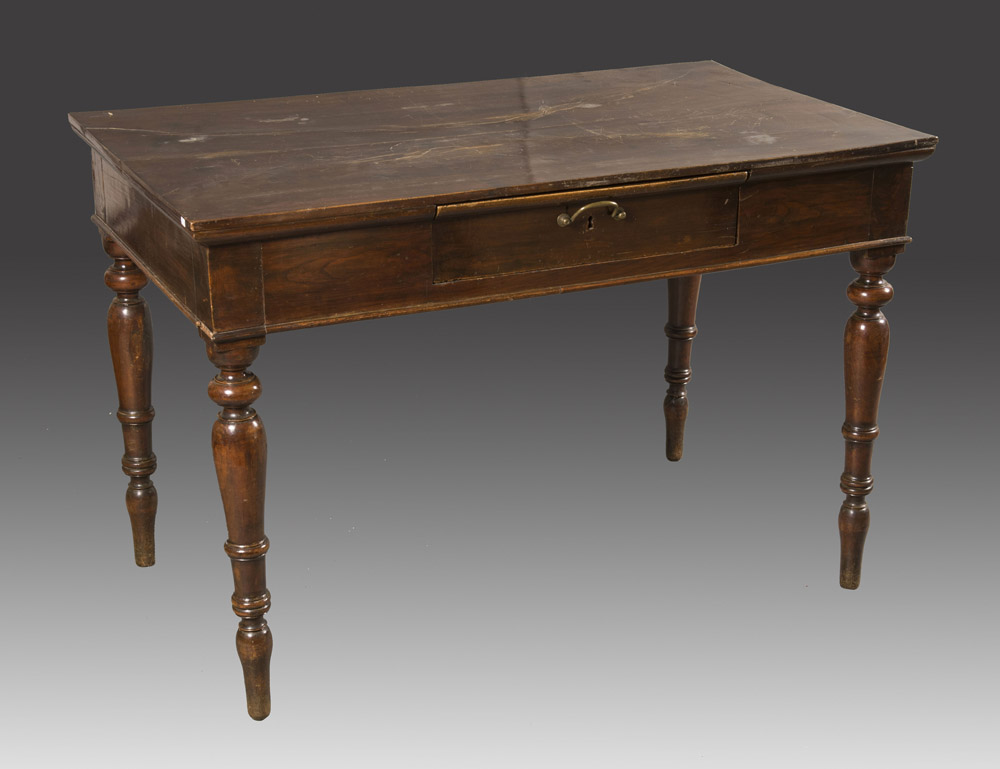 Tavolo scrittoio in noce ad un cassetto sottopiano e quattro gambe tornite....