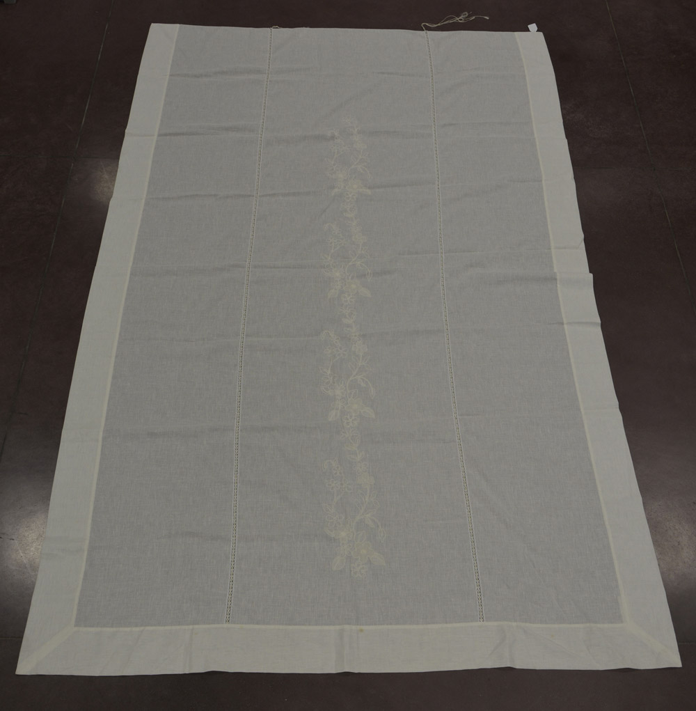 Lotto 740 | Tenda in lino con ricamo a catenella. Sec. XX (cm 210x290) (difetti) Linen...