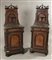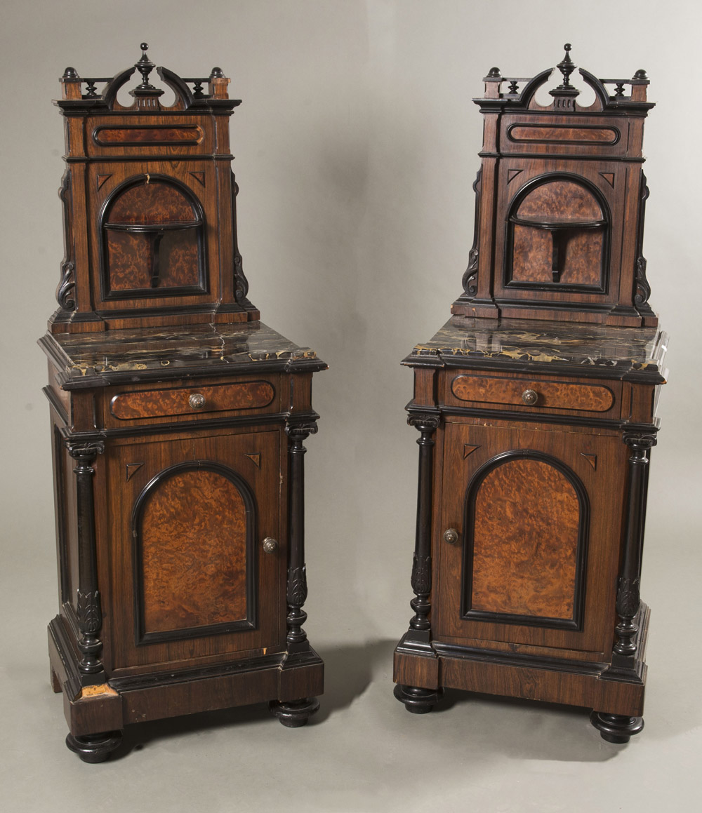 Coppia di comodini lastronati in noce e radica con alzata decorata da pinnacoli e ringhiera traforata ed ebanizzata. Cassetto ed un'anta con montanti a colonna ebanizzata e scolpita a volute. Piedi a cipolla, piani in marmo nero sagomato. Lombardia, sec. XIX (cm 52x140x39) (difetti) Pair of walnut wood and burlwood veneered bedside tables. Lombardy, 19th century (defects)