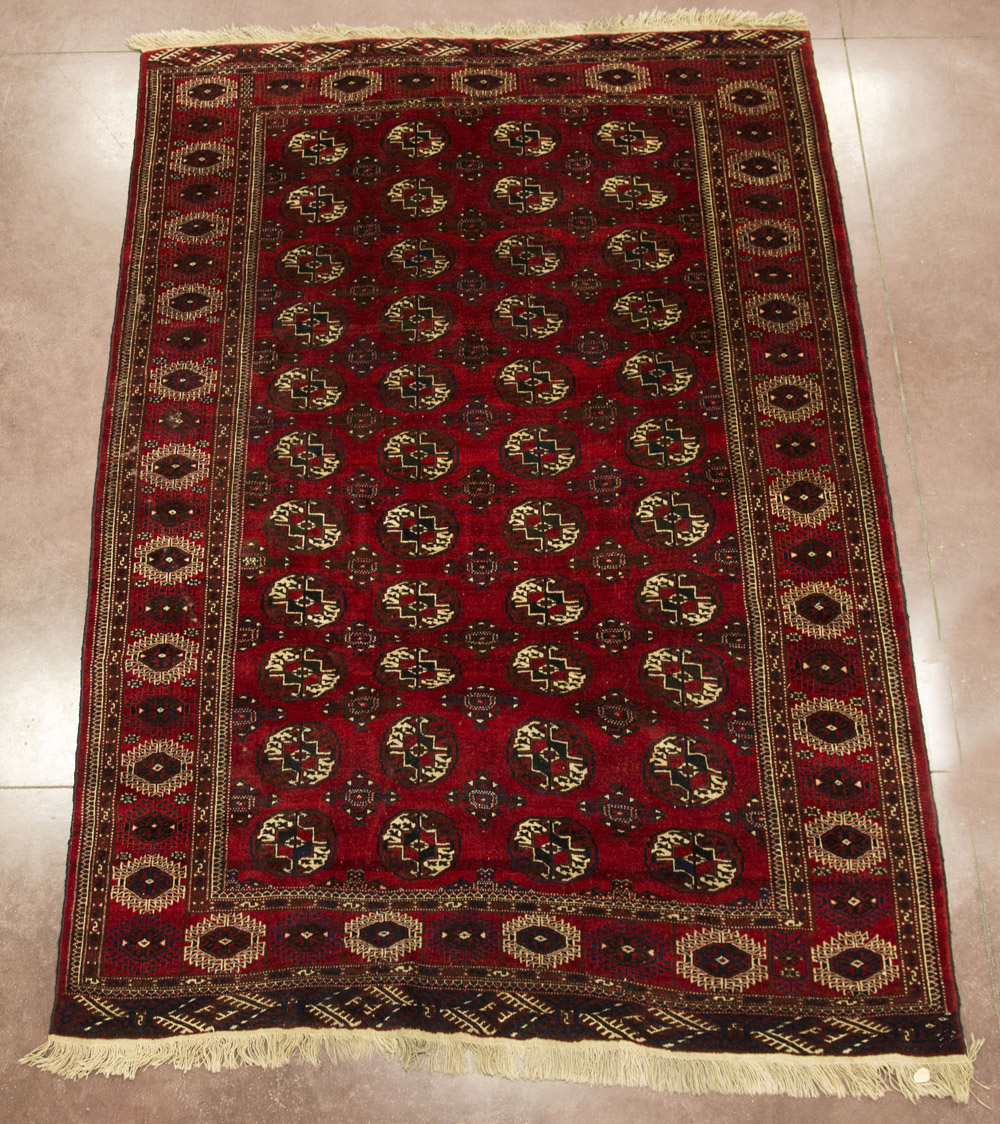 Tappeto Buhkara, Asia Centrale sec. XX disegno a gul su fondo rosso (290x195) (difetti) Bukhara carpet, Central Asia, 20th century (defects)